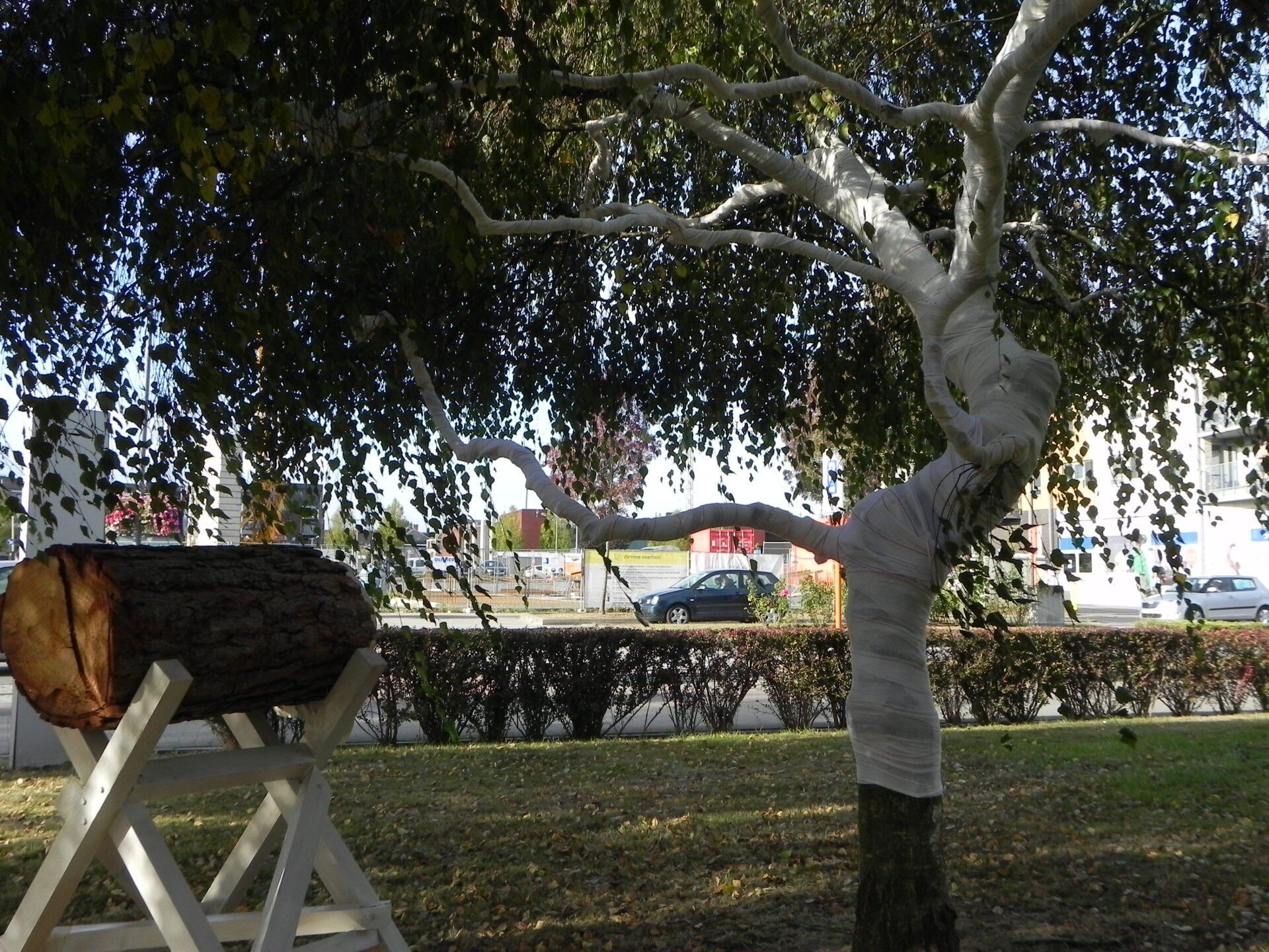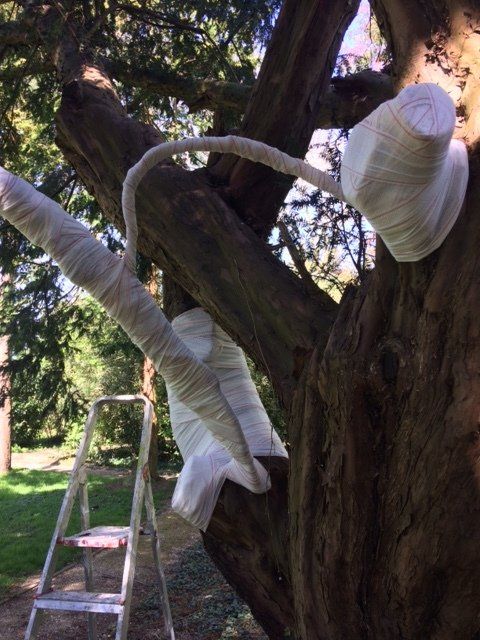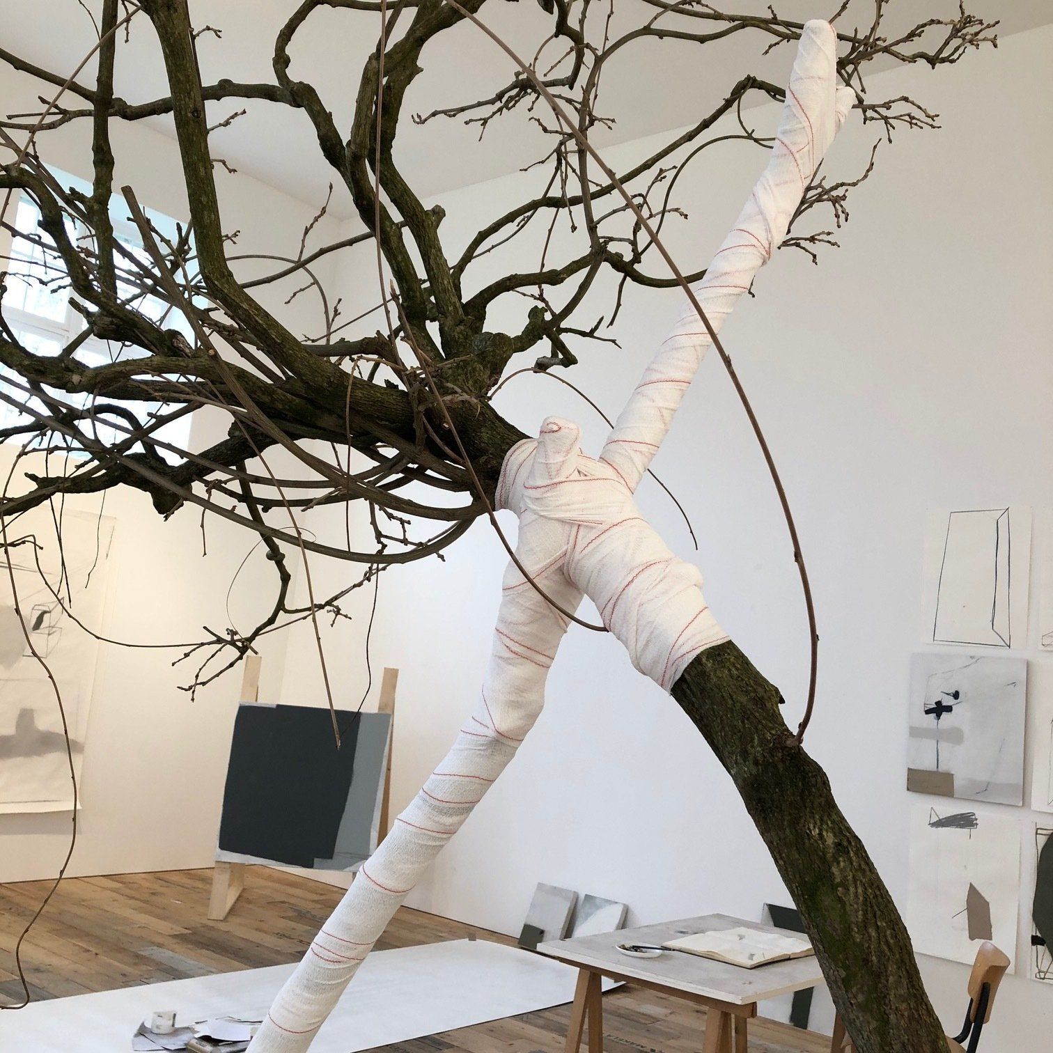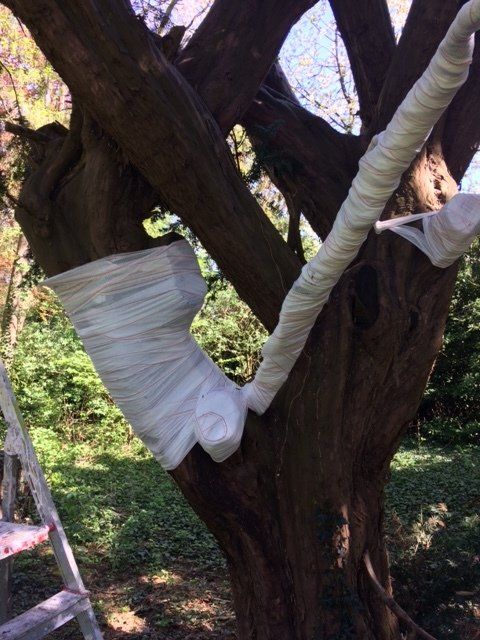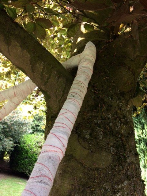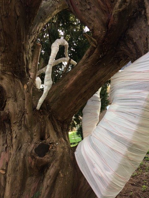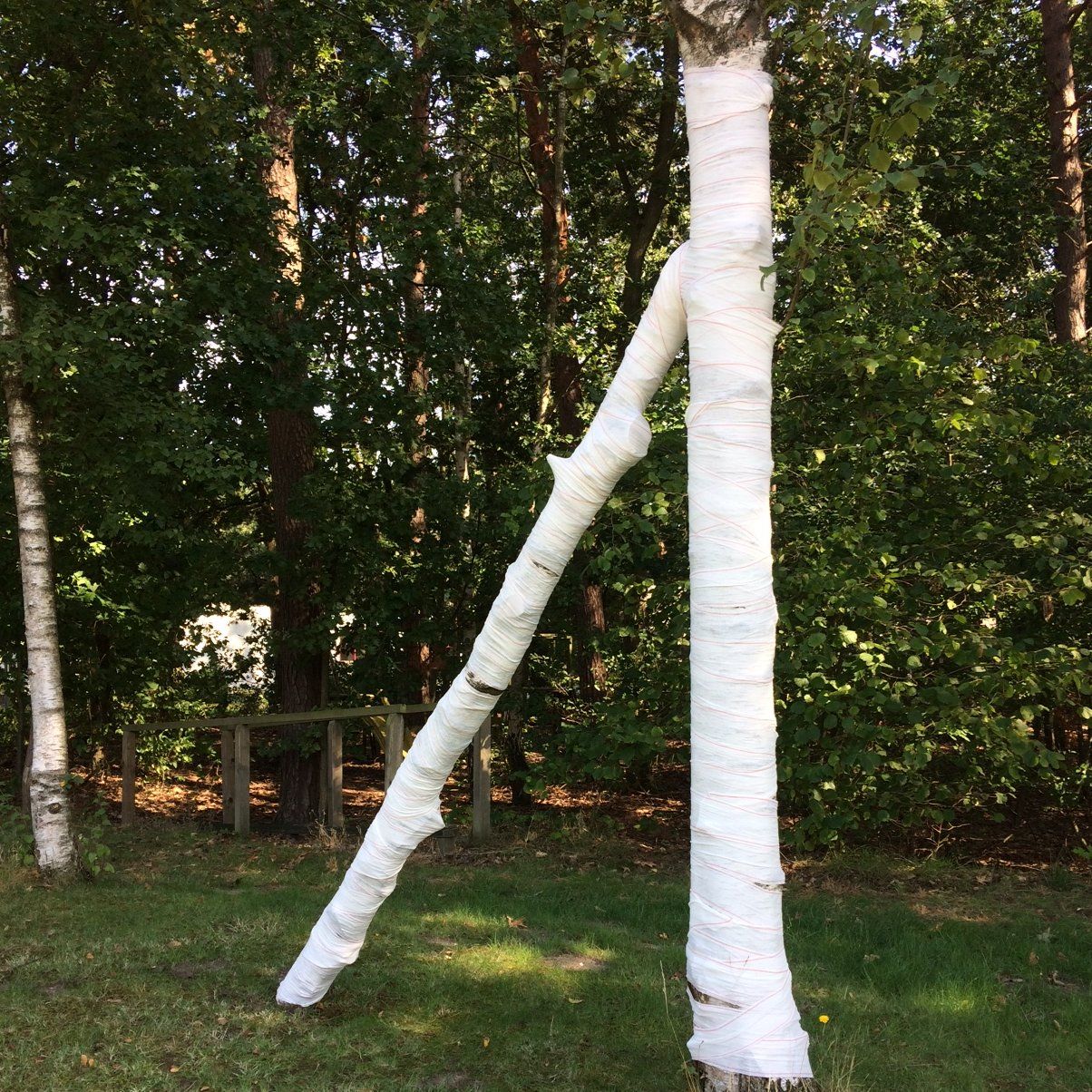 Bomen , takken, objecten worden verzwachteld. Ze worden in windsels gedraaid, beschermd, verzorgd, omwonden en verbonden. Na verloop van tijd worden de windsels verwijderd, deze dragen de sporen van de onzichtbare verwondingen die altijd al aanwezig waren en tevens ook de sporen van de tijd die de vergankelijkheid in zich draagt. Het is niet altijd duidelijk wie er nu juist de windsels nodig had, de ondersteunde of de ondersteuner. De wandelstok en de gebruiker ervan zijn beiden onlosmakelijk met elkaar verbonden.